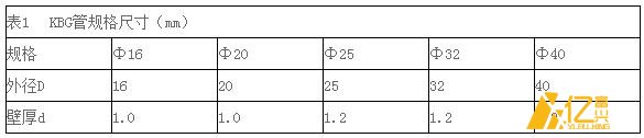 套接扣壓式薄壁鋼導管,簡稱KBG管。導管采用優質冷軋帶鋼,經高頻焊管機組自動焊縫成型、雙面鍍鋅而制成。管材壁厚均勻,卷焊圓度高,與管接頭公差配合好,焊縫小而圓順,管口邊緣平滑。有Φ16、Φ20、Φ25、Φ32、Φ40五種規格,管壁厚度分別為1mm或1.2mm,見表1。導管出廠長度均為4m。